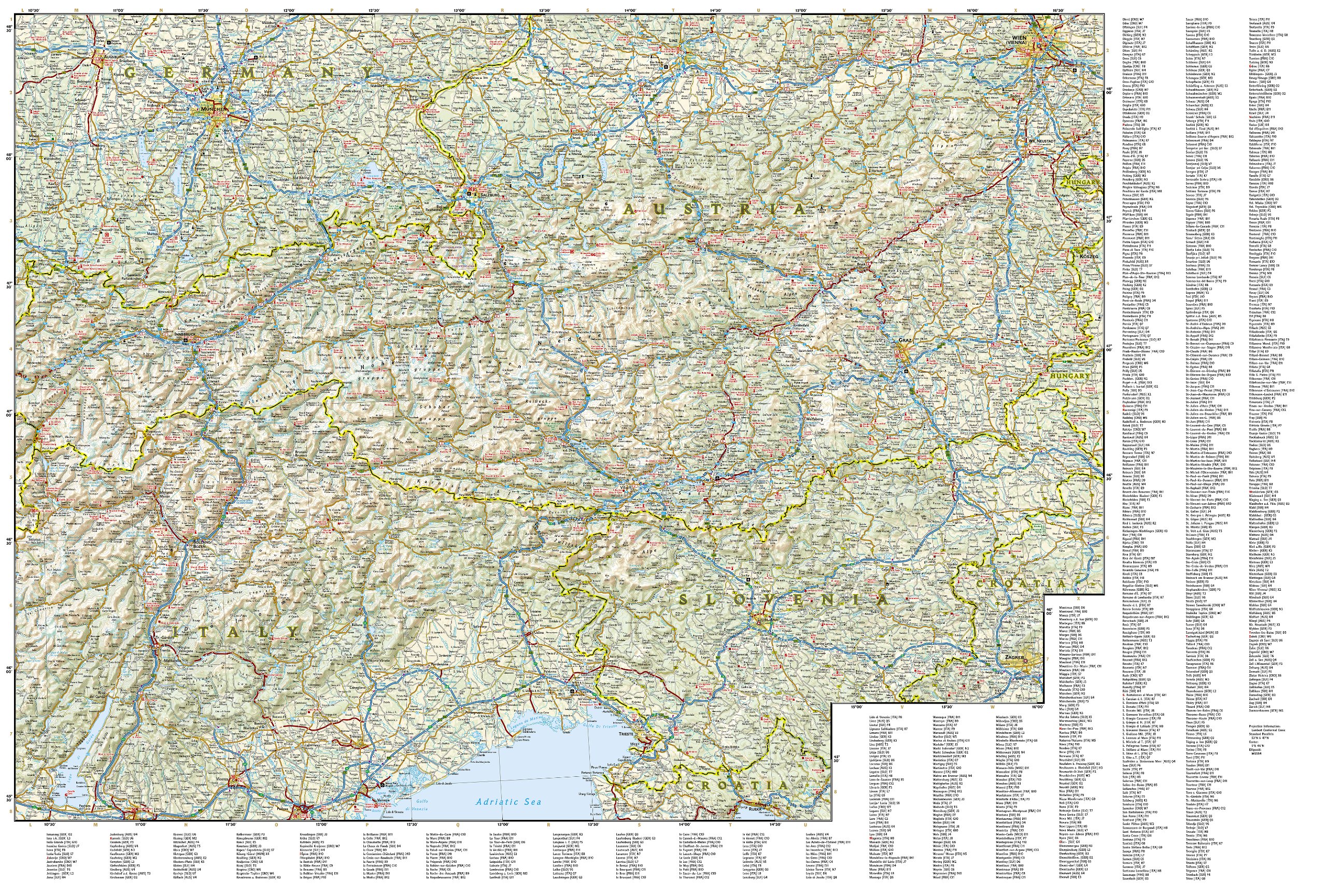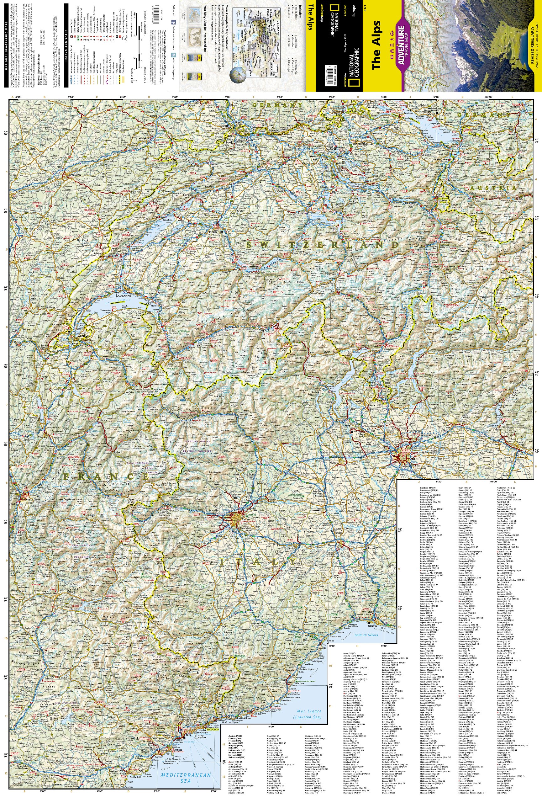 Wegenkaart van de Alpen met vermelding van veel bezienswaardigheden, nationale parken en attrakties. Watervast en scheurvast. Juist door deze vermeldingen onderscheidt de kaart zich van andere wegenkaarten.