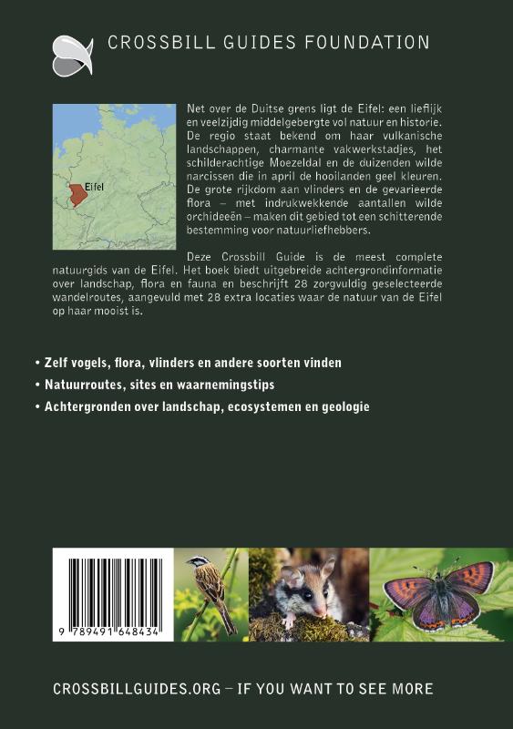 De Crossbill Natuurgids Eifel is een complete natuurreisgids met uitgebreide informatie over landschap, flora en fauna, en bevat 28 routes en 28 locaties waarop je de natuur van de Eifel zelf kunt ontdekken. Het boek is geschikt voor zowel de beginnende natuurliefhebber als de toegewijde vogelaar, planten- en vlinderliefhebber.