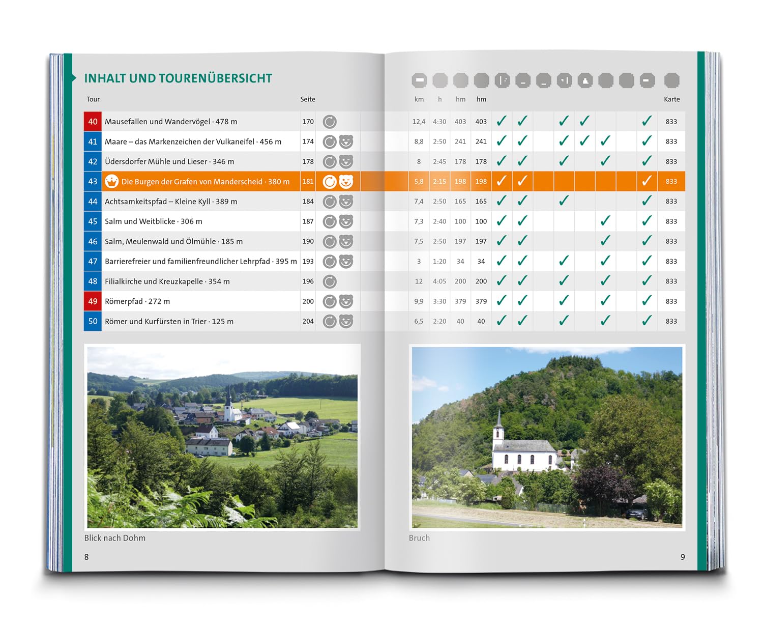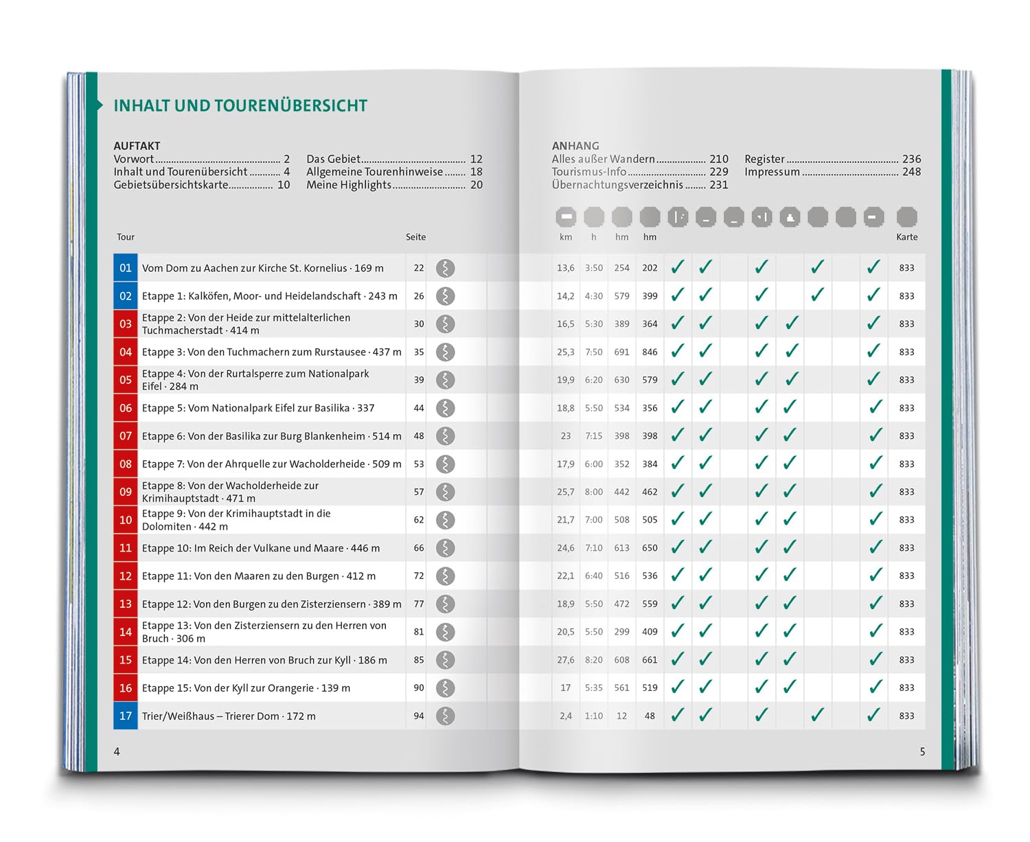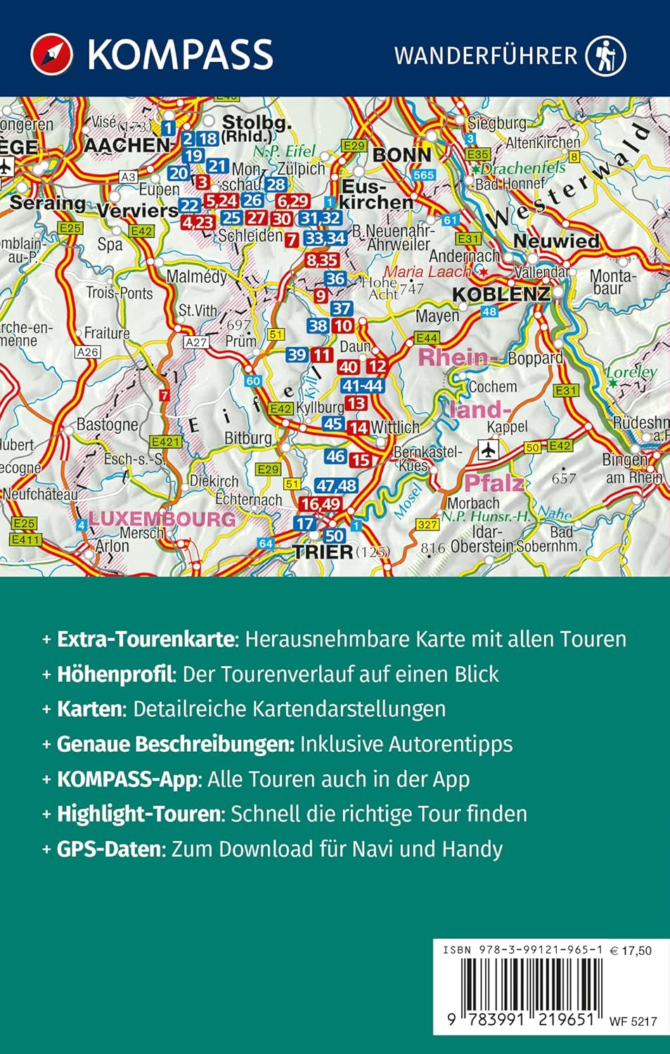 Een meer dan volledige reisgids: 1/In 17 etappes wordt de reis beschreven tussen Aachen en Trier 2/Dan volgen 33 lokale wandelingen 3/ Duidelijke losse overzichtskaart van hele wandelgebied