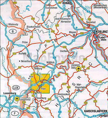 Idesheim, Zemmer im Norden; kyllabwärts über Kordel bis TR-Ehrang; von Ralingen entlang der Sauer über Langsur bis Wasserbillig (L); im Süden moselabwärts von Oberbillig über Konz und Trier bis Ehrang