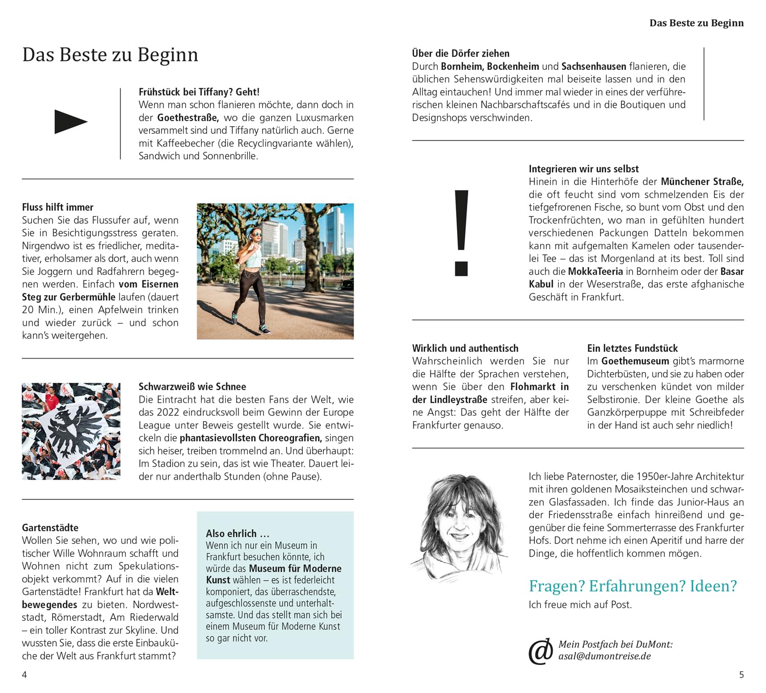 Frankdurt Dumont Direkt is een Duitstalig praktisch stadsgidsje om kennis te maken met Frankfurt, met een grote, uitvouwbare stadsplan achterin. Na een algemene inleiding komen meteen de praktische zaken aan de orde: waar kan je overnachten, waar is het lekker eten, waar is het leuk shoppen en uitgaan, Pas dan zijn de bezienswaardigheden aan de beurt, in de stad en in de nabije omgeving. Achteraan in het gidsje staan een aantal wandelingen beschreven die je in de mooiste hoekjes van de stad brengen.