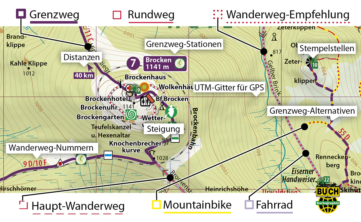 Höhenlinien in 20-Meter-Schritten, 1000m-UTM-Gitter für GPS, Harzklubwanderwege in offizieller Markierung und Nummerierung, thematische Harz-Fernwanderwege, Montainbike-Informationen sowie ausgeschilderte Fahrradwege und Radwanderempfehlungen, Signaturen zu den Sehenswürdigkeiten und Freizeitstätten inklusive Skiliften, Skiabfahrten und Rodelbahnen