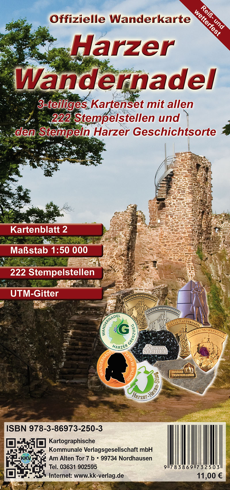 De mogelijkheid om de hele Harzregio met zijn diverse natuurlijke schoonheden, de romantische rots- en rotsformaties en zijn bijzondere bezienswaardigheden te ontdekken en ook om een wandelbadge in verschillende prestatieniveaus te verwerven, kan op grote belangstelling rekenen. 222 aantrekkelijke en gevarieerde postzegellocaties in de Harz wachten erop ontdekt te worden. Of het nu gaat om een uitkijkpunt, een kasteelruïne, een rotsformatie of een gezellige rustplaats, er is voor elk wat wils. De nieuwe officiële kaartenset van de Harzer wandelpin presenteert het Harzgebergte met de 222 stempellocaties op 3 handige, weerbestendige kaarten. Het huidige wandelpadennetwerk van de Harz Club op schaal 1:50.000 maakt het plannen van de wandelroutes en natuurlijk het wandelen naar de stempelpunten eenvoudiger. Een UTM-raster maakt het gebruik van een GPS-apparaat mogelijk en de geïntegreerde terreinarcering visualiseert het middelgebergte.