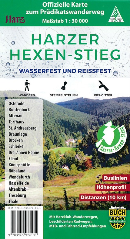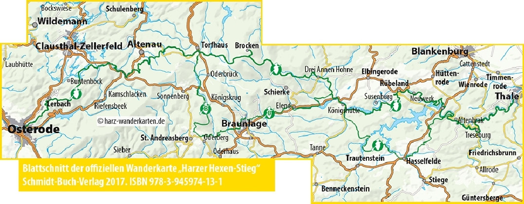 Scheur- en watervast wandelkaart van de Harzer Hexen stieg, het beroemde lange afstands wandelpad door de Harz, Met een schaal van 1:30.000 voor de hele route is de kaart bijzonder gedetailleerd, Op de kaart staat alle noodzakelijke informatie en heel veel meer, met veel extra symbolen worden naast de gewone kaartgegevens ook toeristische zaken duidelijk weergegeven.