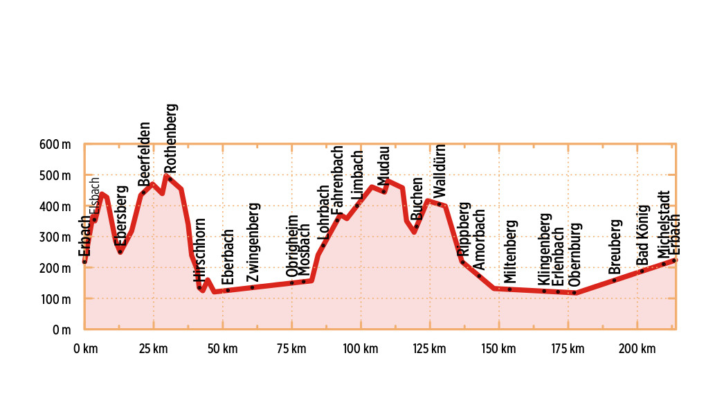 Vor allem im Abschnitt zwischen Erbach und Hirschhorn, aber auch zwischen Mosbach und Walldürn gibt es immer wieder teils starke Steigungen, um die Höhen des Odenwaldes zu erklimmen.