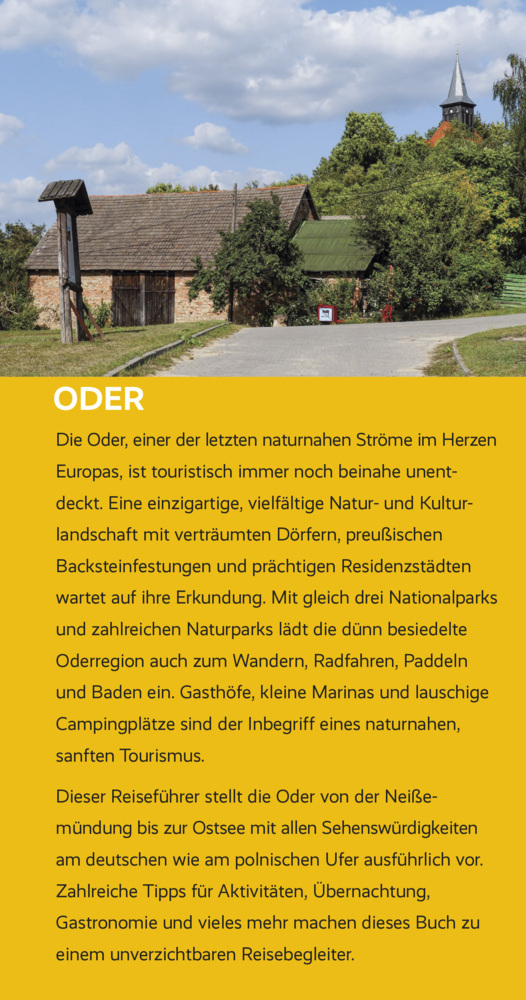 Die Oder, einer der letzten naturnahen Ströme im Herzen Europas, ist touristisch immer noch beinahe unentdeckt. Die erste Auflage des Reiseführers ODER aus dem Trescher Verlag stellt den Fluss von der Neißemündung bis zur Ostsee mit allen Sehenswürdigkeiten am deutschen wie am polnischen Ufer ausführlich vor. Eine vielfältige Natur- und Kulturlandschaft mit verträumten Dörfern, preußischen Backsteinfestungen und prächtigen Residenzstädten wartet auf ihre Erkundung. Mit gleich drei Nationalparks und zahlreichen Naturparks lädt die dünn besiedelte Oderregion in Deutschland und Polen auch zum Wandern, Radfahren, Paddeln und Baden ein. Gasthöfe, kleine Marinas und lauschige Campingplätze sind der Inbegriff eines naturnahen, sanften Tourismus. Die Inseln Usedom und Wolin werden im Reiseführer ebenso behandelt wie die Odermetropole Szczecin (Stettin) und die Doppelstadt Frankfurt (Oder)/Słubice.