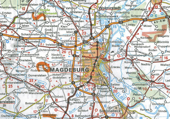 Part of the orange regional series from Michelin, this Germany Northeast map shows this part of Germany in excellent detail. Primary & secondary road networks are clearly marked out with indications of the number of lanes, intermediate distances and various possible road obstacles or things you should know including steep hills, height limits, toll barriers, prohibited roads and roads subject to restrictions.