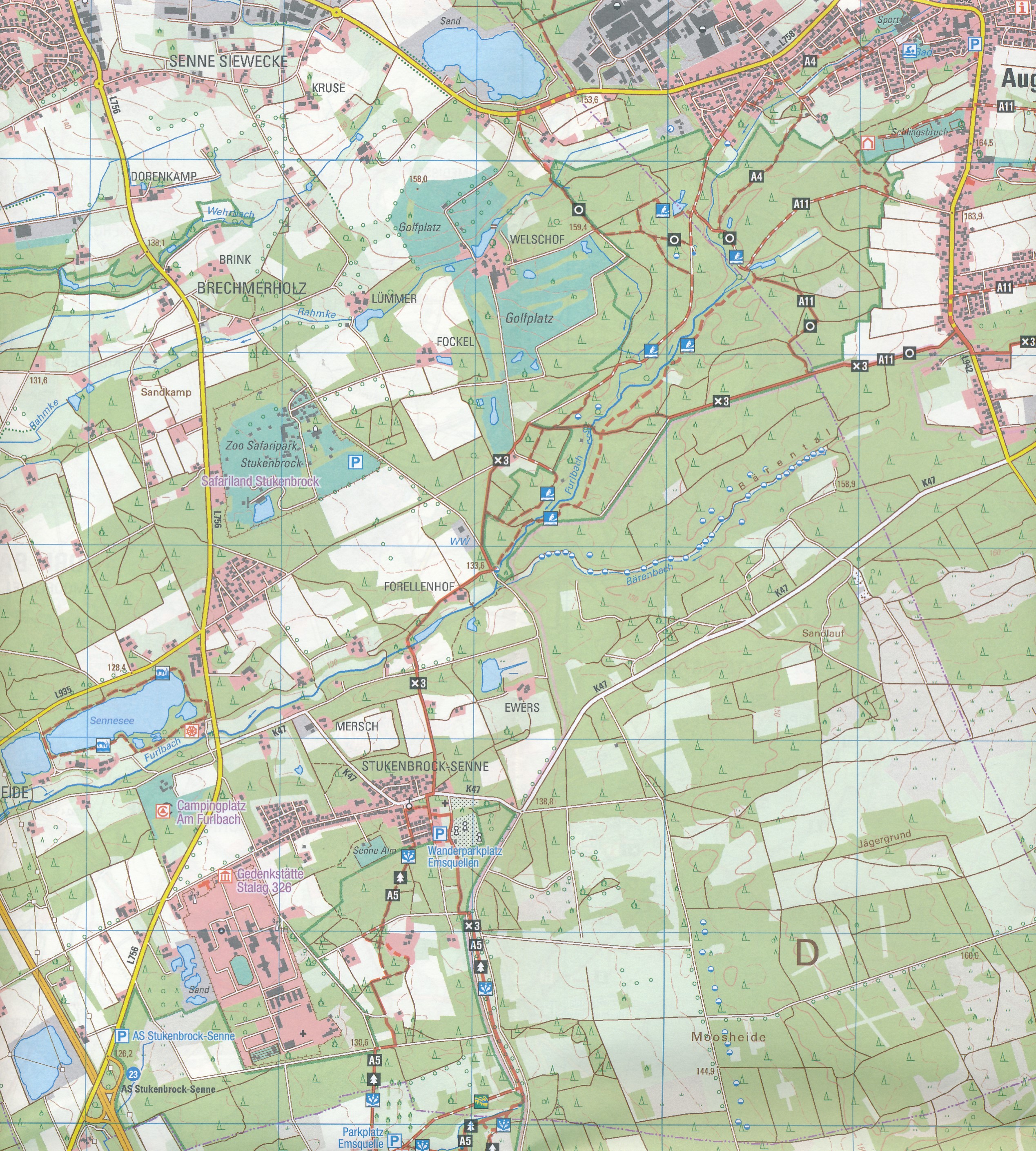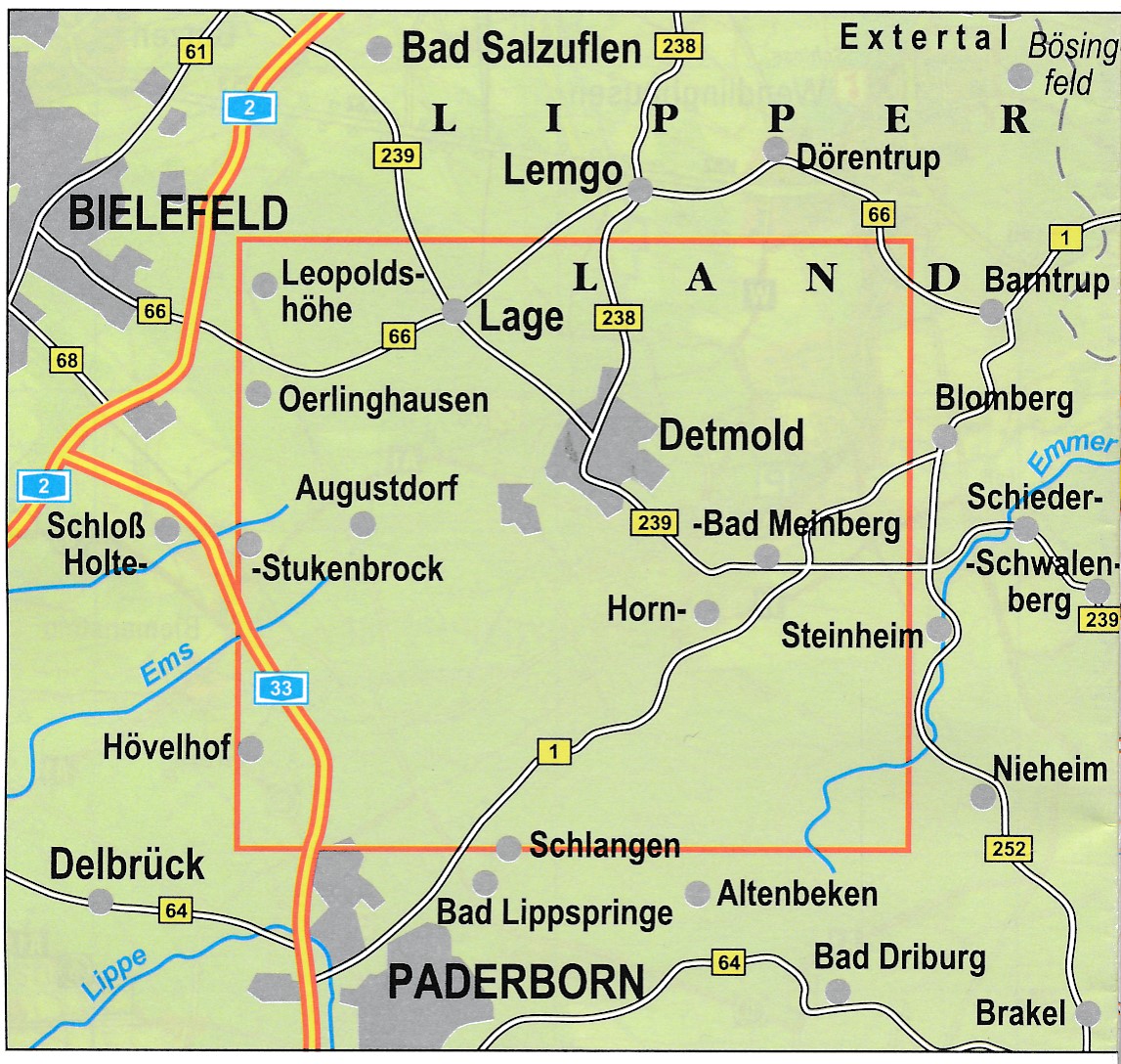 Wanderkarte Hermannsland mit Eggeweg und Hermannsweg 1:25.000 auf Grundlage der amtlichen topographischen Geobasisdaten des Landes NRW und dem Freizeitkataster NRW. Topographische Karte mit Wanderwegen und Freizeitinformationen. In Plastikhülle mit aufgedrucktem Planzeiger