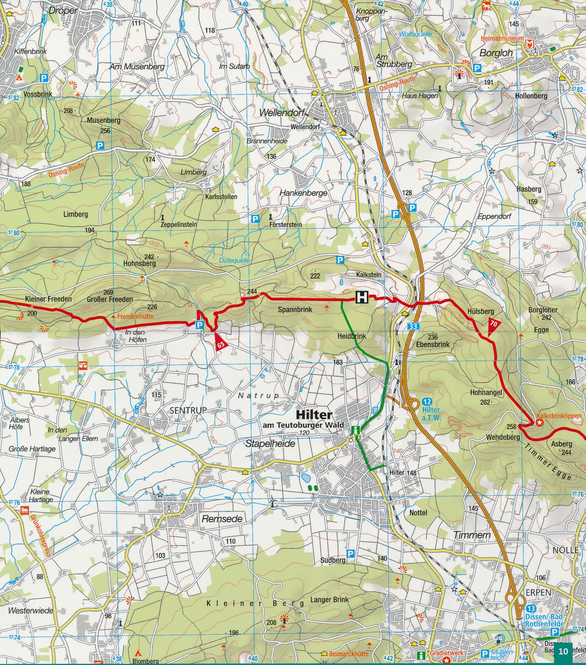 - • Zwei Naturparks liegen am Weg: Terra Vita und der Naturpark Eggegebirge/Südlicher Teutoburger Wald; zahlreiche Schutzhütten; Markierung ist das schwarze „H“ auf weißem Grund.