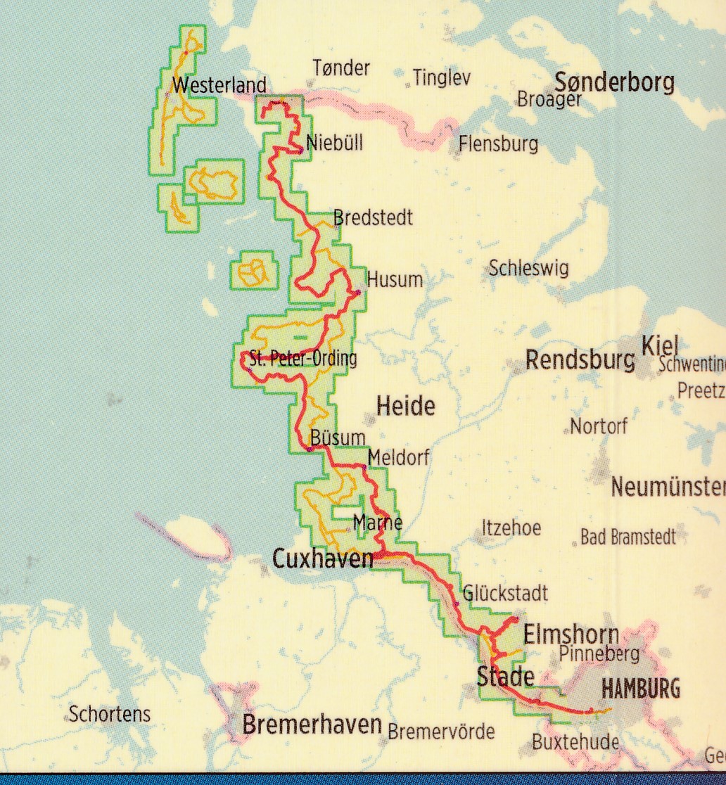 Praktische fietsgids met detailkaarten, ingetekende route, informatie over overnachten en fietsenmakers, zwaarte en hoogteprofiel. In spiraalbinding met geplastificeerde bladzijden. Duitstalig. Deel van de grote NSCR cycleroute > van Hamburg naar Sylt, 357 km.