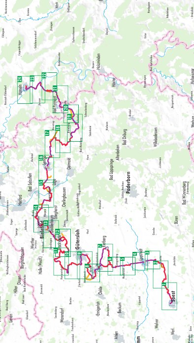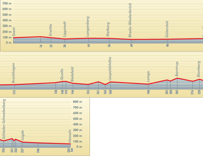 Die Radroute führt von Soest in Richtung Osten durch die sanfthügelige Parklandschaft des Hellweges und streift Stätten der Erholung und Ruhe, nämlich die Bäder Sassendorf, Westernkotten und Waldliesborn. Hinter Lippstadt radelt man durch das Gütersloher Land – eine malerische Landschaft mit Schlössern, Gutshöfen und historischen Stadtkernen. Schließlich erreicht man die Ems in Rheda-Wiedenbrück und folgt ihrem Lauf und dann dem Verlauf ruhiger Radwege nach Gütersloh. Hinter der Stadt radelt man durch herrlich weites Land Richtung Bielefeld und erreicht so den Teutoburger Wald.