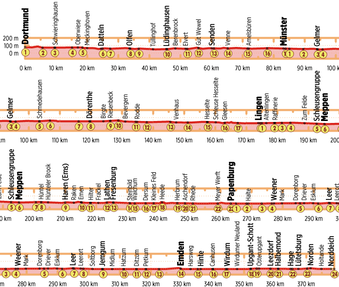Der Dortmund-Ems-Kanal wurde vor mehr als hundert Jahren als Transportweg für Kohle, Stahl und Bier angelegt. Die Bundeswasserstraße führt über 225 Kilometer zunächst von Dortmund aus bis zur Ems und dann als Kanalstrecke parallel zur Ems bis kurz vor Papenburg. Als Verbindung zwischen dem östlichen Ruhrgebiet und der Nordsee gilt der umgangssprachlich als „DEK“ bezeichnete Kanal noch heute als Rückgrat des deutschen Kanalnetzes. Die ca. 380 Kilometer lange Rad-Route Dortmund-Ems-Kanal wurde 1999 anlässlich des hundertjährigen Jubiläums feierlich eröffnet. Schiffsverkehr, Häfen, Schiffshebewerke, Schleusen und Wehre begleiten Sie auf Ihrer spannenden Radreise. Vom Ruhrgebiet mit seinen Industriedenkmälern, durch die Münsterländische Parklandschaft und die Flusslandschaft des Emslandes bis nach Ostfriesland und zur Nordsee führt der Radweg. Sie starten Ihre Radtour in Dortmund, verlassen dieses in nördlicher Richtung und fahren zunächst durch das ländliche Westfalen. Dabei passieren Sie etwa das Schiffshebewerk Henrichenburg bei Waltrop und den größten Kanalknotenpunkt Europas, das „Dattelner Meer“. Entlang der „Alten Fahrt“ kommen Sie nach Olfen und danach nach Lüdinghausen mit seinen Trutzbauten, bevor Sie durch das parkartige Münsterland radeln. Kurz darauf, in Gelmer, treffen sich der Kanal und die Ems das erste Mal. Auf dem zweiten Abschnitt Ihrer Reise fahren Sie bei Bevergern entlang des Höhenzuges des Teutoburger Waldes und rollen kurz nach Rheine, dem Tor zum Emsland über die Grenze nach Niedersachsen. Entdecken Sie das interessante Städtchen Lingen und Meppen, wo Ems und Hase zusammenfließen. Nach Haren nehmen Sie durch die Emsauen Kurs auf Papenburg. Dort können Sie in der Meyer Werft erleben, wie beeindruckende Kreuzfahrtschiffe entstehen. Auf der letzten Etappe Ihrer Tour wird über die norddeutsche Tiefebene Ostfrieslands geradelt. Das Fischer- und Seefahrerstädtchen Leer und Emden, die größte Stadt Ostfrieslands, sind Ihre nächsten Stationen. In Norddeich endet Ihre Tour schließlich. Vom Hafen von Norddeich aus haben Sie nun noch die Möglichkeit, auf die der Küste vorgelagerten Inseln Norderney und Juist überzusetzen und diese ebenfalls zu erkunden, bevor Sie nach einer langen, erlebnisreichen Fahrt im Sattel Ihre Heimreise antreten.