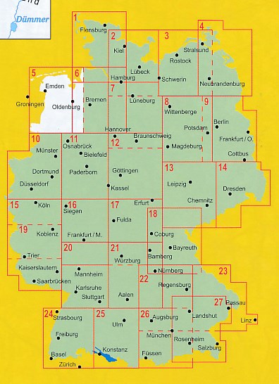 Speciaal voor fietsers gemaakte kaart, waarbij juist de autowegen minder duidelijk te lezen zijn, maar waar de fietspaden gekleurd staan weergegeven. De kleur varieert naarmate de weg beter als fietsroute geschikt is. Lange afstands fietsroutes staan ingetekend, alsmede fietsenmakers, campings en interessante toeristische bezienswaardigheden. Groot voordeel van deze kaartenserie is bovendien dat het een heel groot gebied per kaart bestrijkt: ca. 130 x 160 km.!