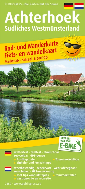 De tweetalige kaart (Duits - Nederlands) geeft een overzicht van het zuidelijke Westmünsterland en het aangrenzende Nederlandse deel. Plaatsen zoals Bocholt, Borken en Winterswijk bieden fietsers en wandelaars een plek om het platteland op grensoverschrijdende routes te verkennen. Waterwegen, waterburchten en kastelen bieden afwisseling in de tochten. Verdere tips voor tussenstops zijn te vinden in het infopaneel aan de achterkant.Reviews