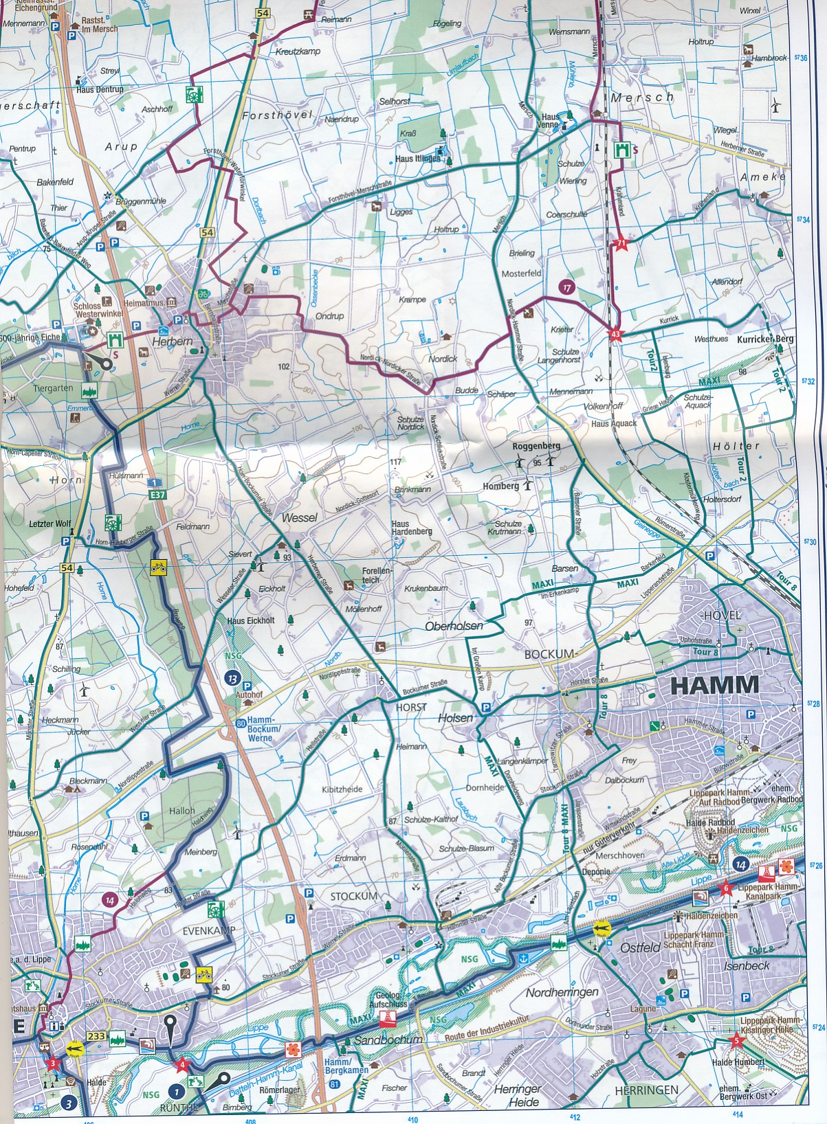 Darstellung aller Radfernwege, Haupt- und Nebenradwege dieser Region inklusive Radwegenamen und Symbole.