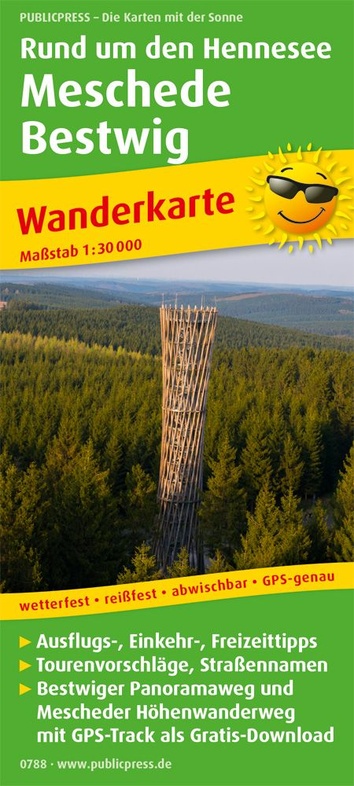 Mit 39 Mio m³ Stauinhalt, nahe Meschede gelegen, ist der Hennesee ein landschaftlicher Anziehungspunkt. Wunderschöne Wege umrunden das Trinkwasserreservoir und führen in die Umgebung. Zu entdecken gilt es Meschede und Bestwig sowie das herrliche Wandergebiet im Arnsberger Wald. Besonders empfehlenswert ist der Bestwiger Panoramaweg, der durch die sauerländische Region von Nord nach Süd und zurück führt. Neben einer Gesamtbeschreibung des Rundwegs, finden sich auf der Rückseite Erläuterungen zu weiteren lohnenswerten regionalen Wanderstrecken.