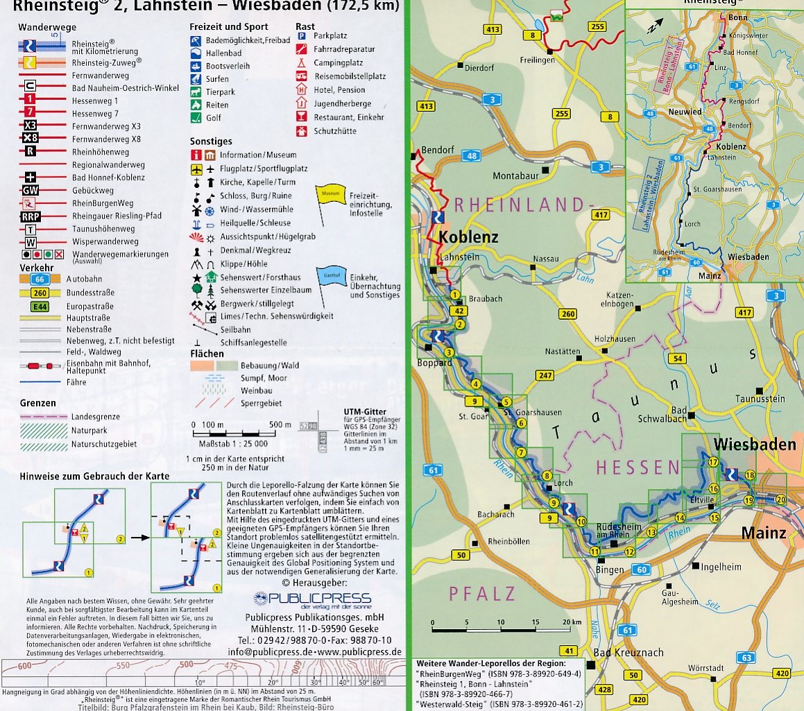 Die Wanderkarte beschreibt den zweiten Teil des Premiumwanderweges von Lahnstein bei Koblenz bis Wiesbaden im Leporello-Format. Die 172,5 km führen naturnah am rechtsrheinischen Ufer entlang; auch auf schmalen Pfaden in angrenzende Wälder und Weinberge durch die Regionen Mittelrhein und Rheingau. Welche Sehenswürdigkeiten außer der Loreley noch auf diesem Weg locken, erfährt man in den bebilderten Infoblöcken, die zwischen den Kartenabschnitte eingefügt sind