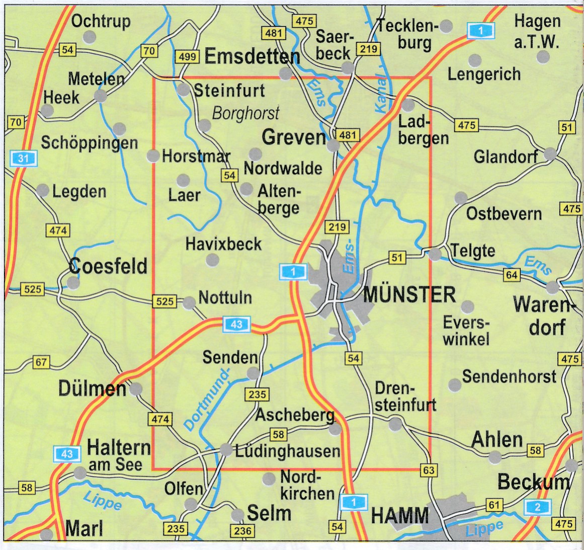 Wanderkarte Münster und Umgebung 1:35.000 auf Grundlage der amtlichen topographischen Geobasisdaten des Landes NRW und dem Freizeitkataster NRW. Topographische Karte mit Wanderwegen und Freizeitinformationen.