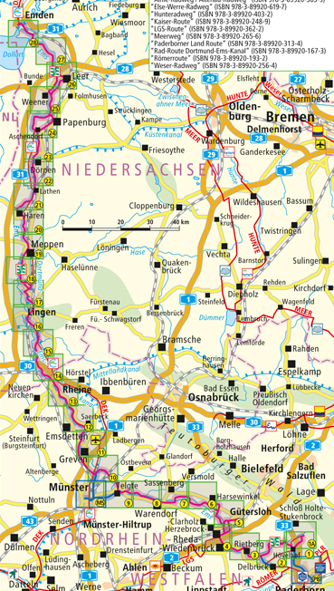 Die Radwanderkarte EmsRadweg mit praktischer Leporello-Falzung folgt der Ems von ihren Quellen im Paderborner Land bis zur Mündung in den Dollart und die Nordsee. Die 375 km lange Tour eignet sich hervorragend für Radler, ist sie doch durch gut ausgebaute Wege und eine weitgehend flache Streckenführung gekennzeichnet. Neben Feld- und Waldlandschaft durchquert sie die Münsterländer Park- und Auenlandschaft, das von Kanälen geprägte Emsland und das wasserreiche Ostfriesland. Wo sich Zwischenstopps anbieten, erfährt man im Textteil der Radwanderkarte EmsRadweg.