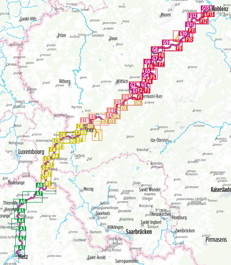Praktische fietsgids met detailkaarten, ingetekende route, informatie over overnachten en fietsenmakers, zwaarte en hoogteprofiel. In spiraalbinding. Duitstalig. Van Metz (Frankrijk) naar de Rijn langs de Moezel, lengte 304 km.