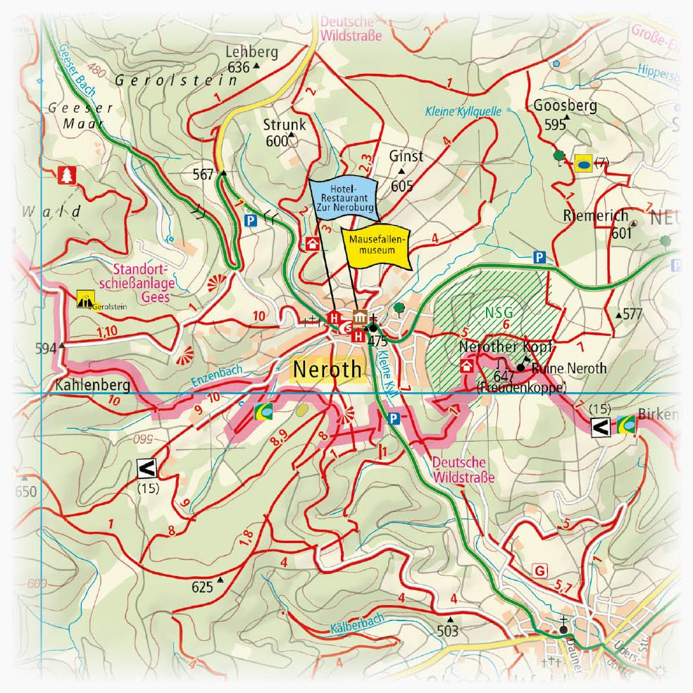 De Maare tussen Daun en Manderscheid, de bekende cirkelvormige wateren, zijn typerend voor de lage bergketen en bieden unieke inzichten in het ontstaan van de vulkaaneifel. Alleen al 15 gemarkeerde wandelpaden en 5 langeafstandsfiets-routes maken de Eifel van Nürburgring naar Manderscheid tot een paradijs voor actieve vakantiegangers. Let op: Conditie is vereist in deze lage bergketen! Verdere wetenswaardigheden over informatie vindt u op de achterkant van de kaart.Reviews
