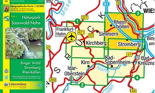 Mooie wandelkaart uit een serie van 4 delen van Natuurpark Soonwald-Nahe, tussen Koblenz en Kaiserslautern. Prettig kleurgebruik, erg veel detail en aangegeven routes.