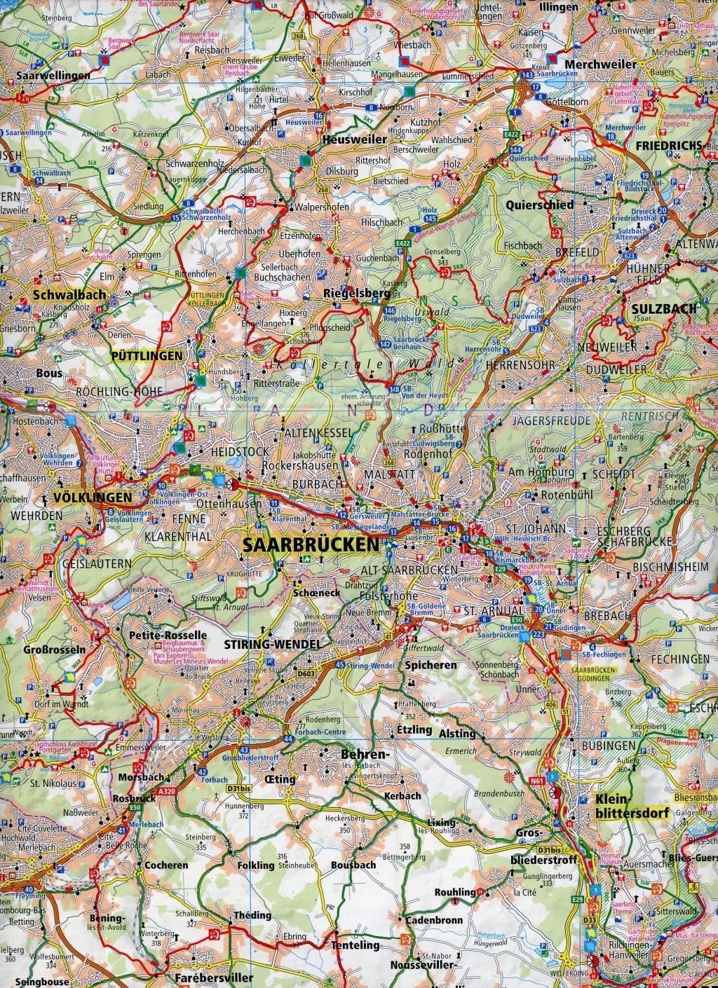 Het feit dat 16 fietspaden zijn opgenomen in het kaartgedeelte van het Saarland, getuigt van een landschap dat goed is ontwikkeld voor fietsers. Opmerkelijk zijn grensoverschrijdende fietspaden rond Saarbrücken naar Frankrijk en de sportieve route door het natuurpark Saar-Hunsrück en de West-Palts. Speciaal gemarkeerde mountainbikeroutes rondom St. Wendel bewijzen de steile beklimmingen. Informatie over steden en kleinere steden is te vinden op de achterkant.Reviews