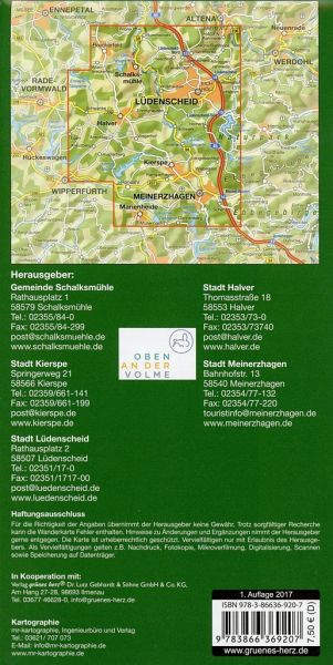 Die Städte und Gemeinden Lüdenscheid, Meinerzhagen, Kierspe, Halver, Schalksmühle haben erstmals eine gemeinsame Wanderkarte für das Obere Volmetal herausgebracht.Damit wurde ein weißer (Wander-)Fleck im Sauerland beseitigt. Auf über 500 km, über Höhenlagen, an Flusstälern, durch die Städte und an vielen Sehenswürdigkeiten vorbei ist für jeden Wanderer die geeignete Strecke dabei.
