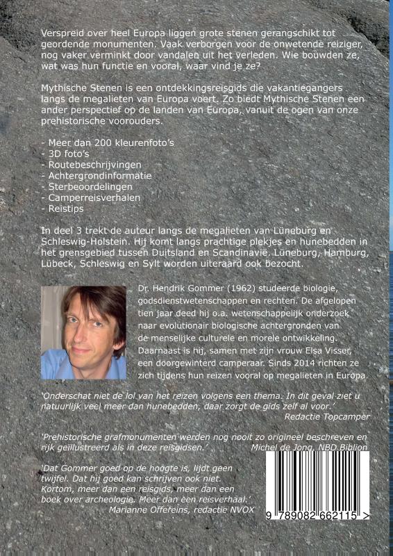Verspreid over heel Europa liggen grote stenen gerangschikt tot geordende monumenten. Vaak verborgen voor de onwetende reiziger, nog vaker verminkt door vandalen uit het verleden. Wie bouwden ze, wat was hun functie en vooral, waar vind je ze? Mythische Stenen is een ontdekkingsreisgids die camperaars en andere reizigers langs de megalieten van Europa voert. De reiziger komt als vanzelf langs allerlei andere bezienswaardigheden. Zo biedt Mythische Stenen een ander perspectief op de landen van Europa, vanuit de ogen van onze prehistorische voorouders. - Meer dan 200 kleurenfotos - 3D fotos - Routebeschrijvingen - Achtergrondinformatie - Sterbeoordelingen - Camperreisverhalen - Reistips In deel 3 trekt de auteur langs de megalieten van Lüneburg en Schleswig-Holstein. Hij komt langs prachtige plekjes en hunebedden in het grensgebied tussen Duitsland en Scandinavië. Lüneburg, Hamburg, Lübeck, Schleswig en Sylt worden uiteraard ook bezocht. Onderschat niet de lol van het reizen volgens een thema. In dit geval ziet u natuurlijk veel meer dan hunebedden, daar zorgt de gids zelf al voor. Redactie Topcamper