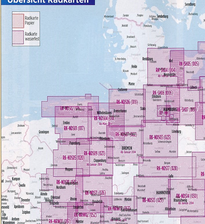 Gedetailleerde kaart van Niederrhein Nord. Routes staan duidelijk ingetekend. Ook informatie over fietsenmakers, accommodatie etc. Het is een zeer gedetailleerde fietskaart met fietspaden (verhard en onverhard) en ingetekende fietsroutes, stijgingspercentages en afstanden, toeristische informatie, campings en hotels en straatnamen. Met UTM grid, GPS geschikt.