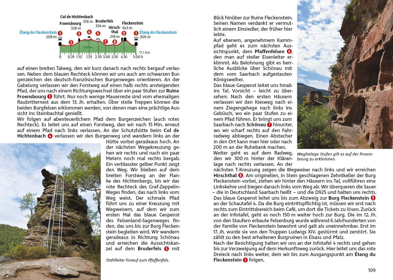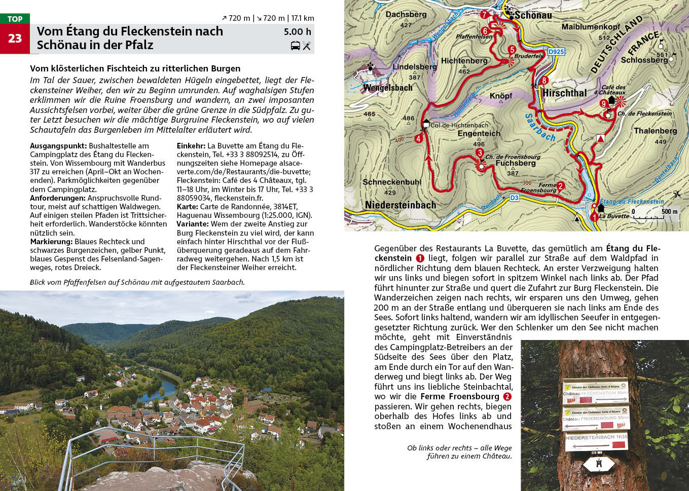 Auf gegenüberliegender Rheinseite, in der Südpfalz, wandert man auf sandigen Wegen unter Edelkastanien. Burgruinen und bizarre Sandsteinformationen findet man auf Schritt und Tritt. Jenseits der Grenze, im Norden des Elsass, lassen sich mittelalterliche Ruinen über waghalsige Treppen und Leitern erklimmen.