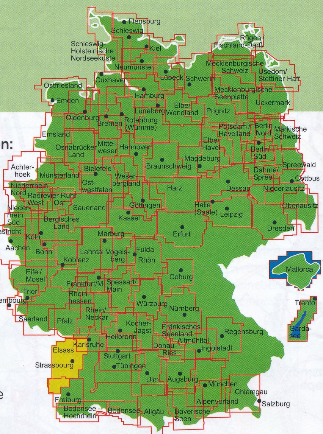 ADFC recommended topographic cycling maps of popular regions of Germany giving details of routes, volume of traffic so you can choose the calmest route, details of gradients, camp sites, & tourist information. With these maps you can work out a route to suit all tastes, whether for family or for mountain bikers.