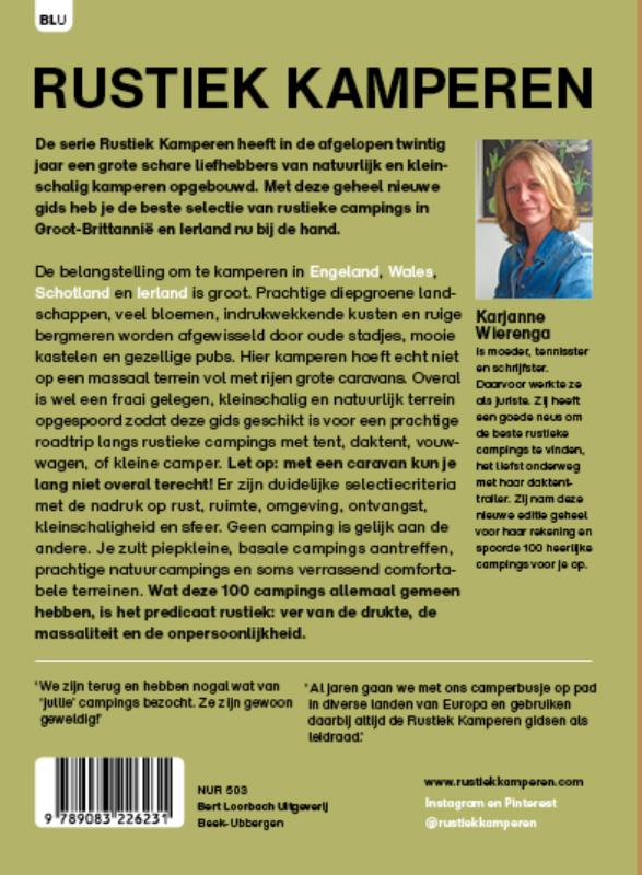 De serie Rustiek Kamperen heeft in de afgelopen twintig jaar een grote schare liefhebbers van natuurlijk en kleinschalig kamperen opgebouwd. Met deze geheel nieuwe gids heb je de beste selectie van rustieke campings in Groot-Brittannië en Ierland nu bij de hand. De belangstelling om te kamperen in Engeland, Wales, Schotland en Ierland is groot. Prachtige diepgroene land- schappen, veel bloemen, indrukwekkende kusten en ruige bergmeren worden afgewisseld door oude stadjes, mooie kastelen en gezellige pubs. Hier kamperen hoeft echt niet op een massaal terrein vol met rijen grote caravans. Overal is wel een fraai gelegen, kleinschalig en natuurlijk terrein opgespoord zodat deze gids geschikt is voor een prachtige roadtrip langs rustieke campings met tent, daktent, vouwwagen, of kleine camper. Let op: met een caravan kun je lang niet overal terecht! Er zijn duidelijke selectiecriteria met de nadruk op rust, ruimte, omgeving, ontvangst, kleinschaligheid en sfeer. Geen camping is gelijk aan de andere. Je zult piepkleine, basale campings aantreffen, prachtige natuurcampings en soms verrassend comfortabele terreinen. Wat deze 100 campings allemaal gemeen hebben, is het predicaat rustiek: ver van de drukte, de massaliteit en de onpersoonlijkheid.