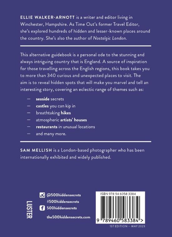 This alternative guidebook is a personal ode to the stunning and always intriguing country that is England. A source of inspiration for those travelling across the English regions, this book takes you to more than 340 curious and unexpected places to visit. The aim is to reveal hidden spots that will make you marvel and tell an interesting story, covering an eclectic range of themes such as: — seaside secrets — castles you can kip in — breathtaking hikes — atmospheric artists’ houses — restaurants in unusual locations — and many more. ELLIE WALKER-ARNOTT is a writer and editor living in Winchester, Hampshire. As Time Out’s former Travel Editor, she’s explored hundreds of hidden and lesser-known places around the country. She’s also the author of Nostalgic London. SAM MELLISH is a London-based photographer who has been internationally exhibited and widely published.Reviews