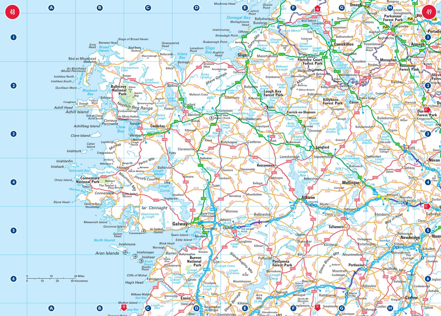 The maps of Britain are at 9.9 miles to 1 inch (1:625,000) and the whole of Ireland is covered at 15.8 miles to 1 inch (1:1,000,000). There are also a selection of more detailed urban area maps at 4.5 miles to 1 inch (1:285,000) to aid route planning in these busy areas.