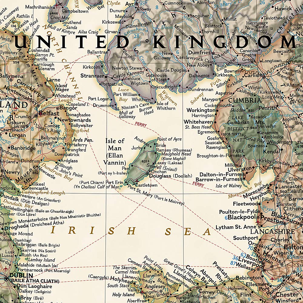 This map of Britain and Ireland shows country boundaries, thousands of place names, major roadways, airports, bodies of water, and more. Rich earth-toned colors, astounding detail and boardroom quality make this map excellent for reference in your home or office.