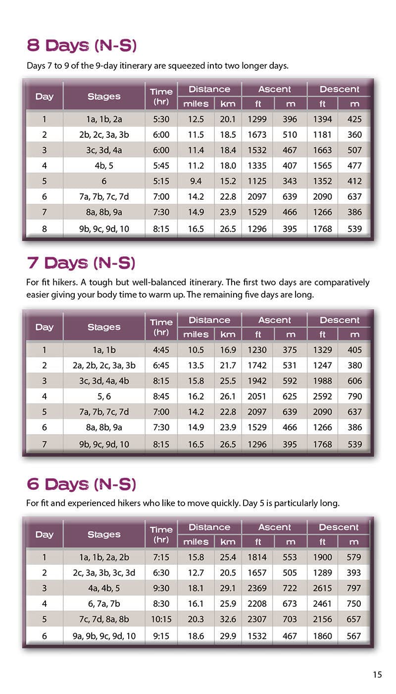 18 different itineraries: schedules of 4, 5, 6, 7, 8, 9, 10, 11 and 12 days for hikers and runners. Includes both southbound and northbound itineraries. Difficult calculations of time, distance and altitude gain/loss are done for you.