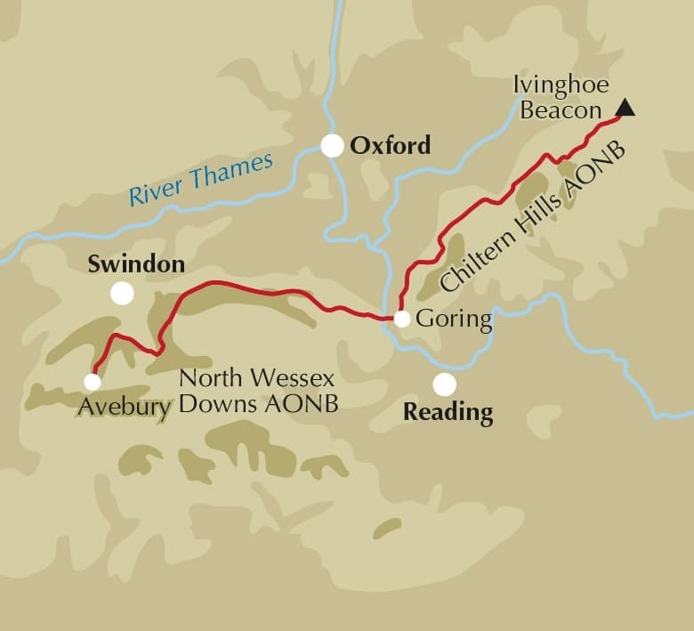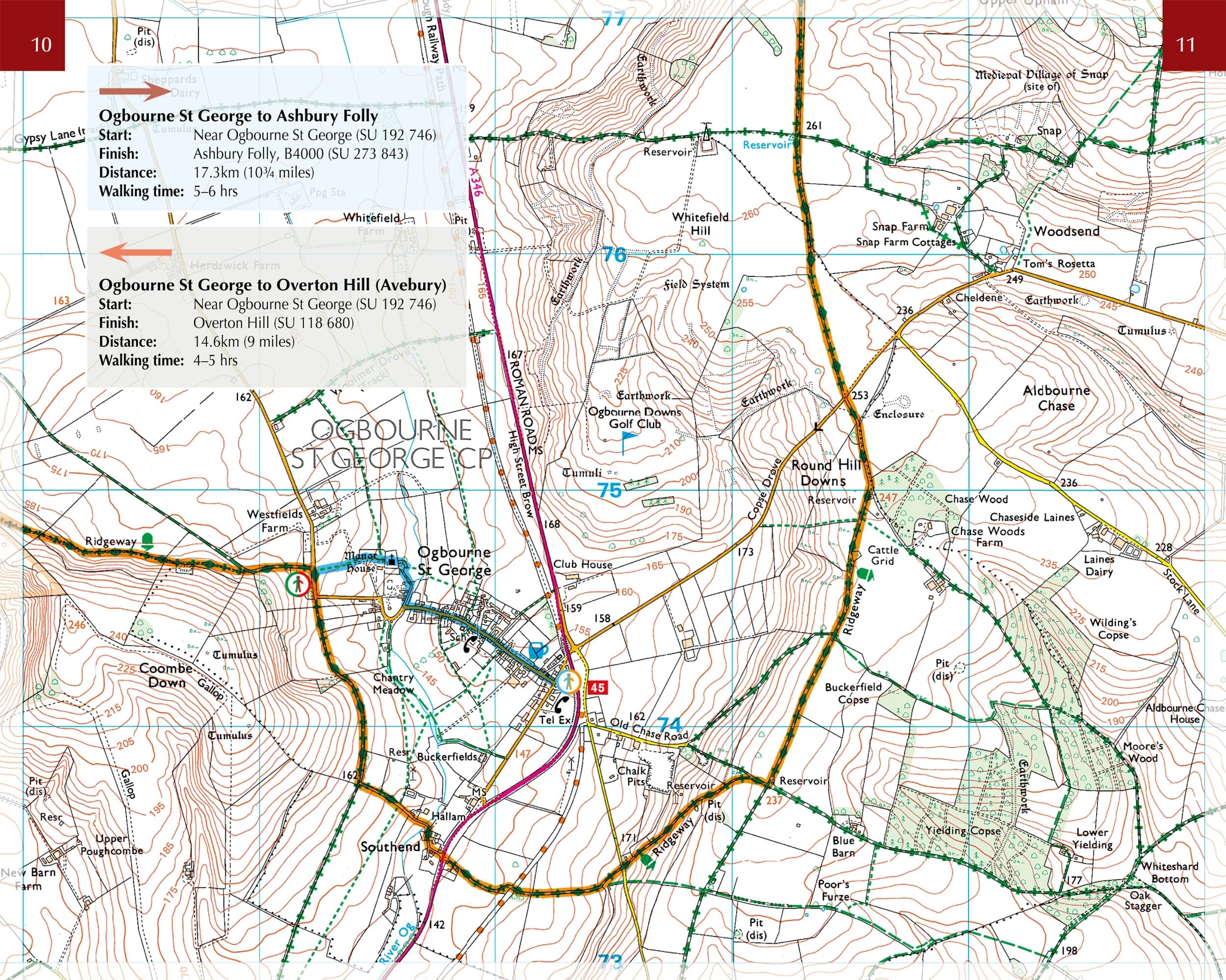 Map of the 87 mile (139km) Ridgeway National Trail through the south of England from Avebury in Wiltshire to Ivinghoe Beacon in Buckinghamshire. This booklet is included with the Cicerone guidebook to the trail, and shows the full route on Ordnance Survey 1:25,000 maps. Presented in 12 stages in the guidebook, the trail typically takes 6-8 days.