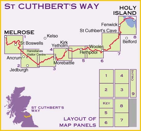 The Way links places associated with the life of the 7th century saint, Cuthbert. From Melrose Abbey to Holy Island (Lindisfarne). 100km (62 miles). This map shows the entire route on one sheet. The map is bio-degradable