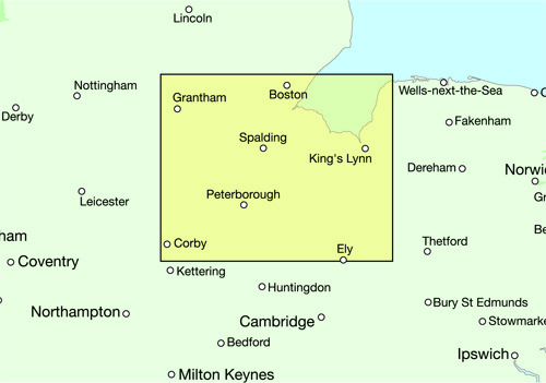 This map shows the National Cycle Network and recommended cycle routes for The Fens (see map below). There are also five mapped circular day rides. Including the Fenland Trail, the Fens Cycleway and Peterborough’s Green Wheel, plus five day rides: Boston Circular, Grantham Circular, Lanes South West of Spalding, Around Rutland Water, and Sleaford Circular. Street plans show Peterborough,Boston, Grantham, King’s Lynn and Wisbech