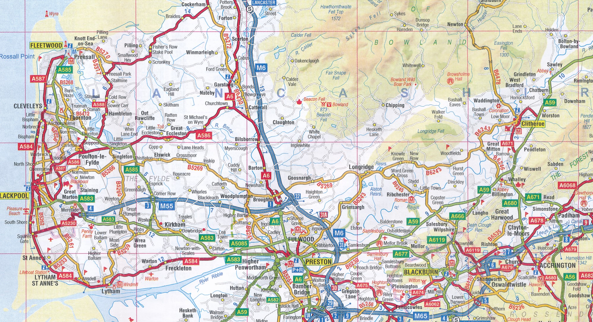 Overzichtskaart van een groot deel van het noorden van Engeland. Pluspunt van deze kaart is het grote gebied dat deze bestrijkt en dat met rode symbolen alle bezienswaardigheden goed aangeduid zijn.