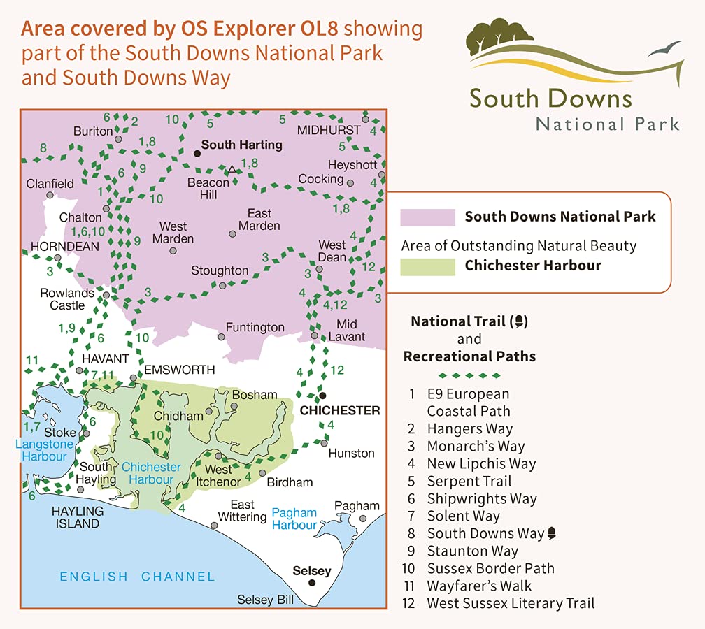 OS Explorer map sheet OL 8 covers Chichester, South Harting, Selsey, Emsworth, Havant, Horndean, Midhurst and Wittering. Highlights of the area include: Hayling Island, Selsey Bill, Chichester Harbour, Sussex Downs, East Hampshire, and South Downs Way. It is a direct replacement for Explorer 120.