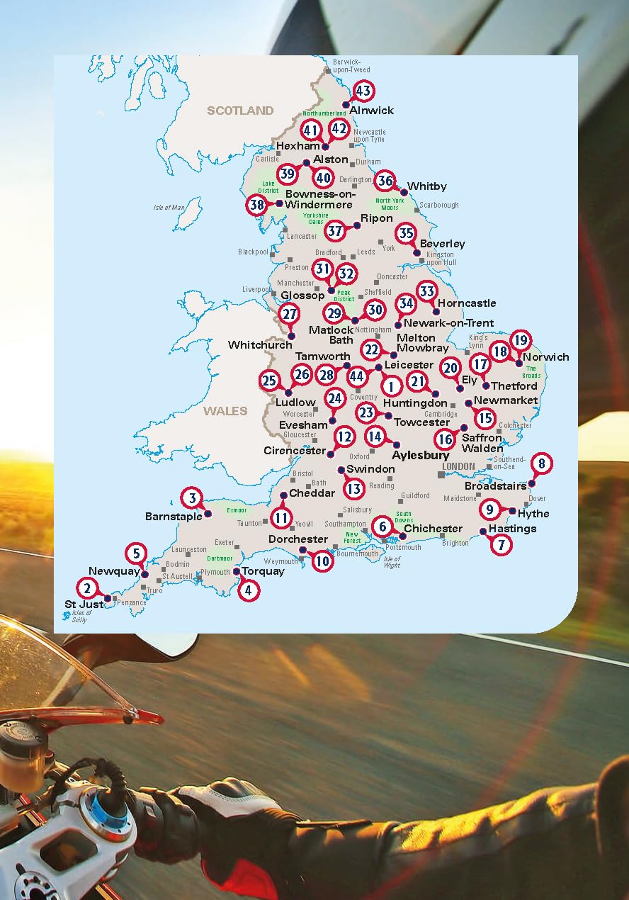 UItgebreide gids, met handige ringband, voor motortochten door Engeland, Wales en Schotland.