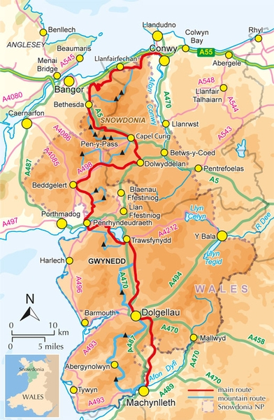 Machynlleth, Abergynolwyn, Dolgellau, Trawsfynydd, Penrhyndeudraeth, Beddgelert, Pen-y-Pass, Dolwyddelan, Capel Curig, Bethesda, Llanfairfechan, Conwy