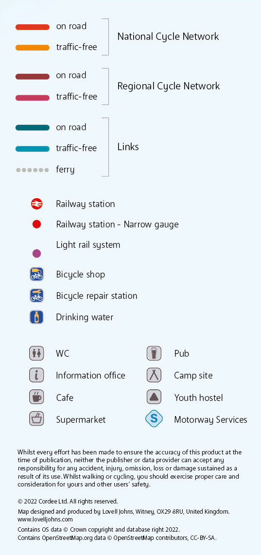 Een nieuwe fietskaarten serie van Groot-Brittannië. Gedrukt op scheur- en watervast papier en mooi handzaam klein formaat. Deze kaarten zijn met name heel goed om de Lange Afstands Fietsroutes (LF) te fietsen, het National Cycle Network staat duideljk ingetekend. Daarnaast vind je op de kaart veel praktische informatie als fietsenmakers, campings, jeugdherbergen en supermarkt.
