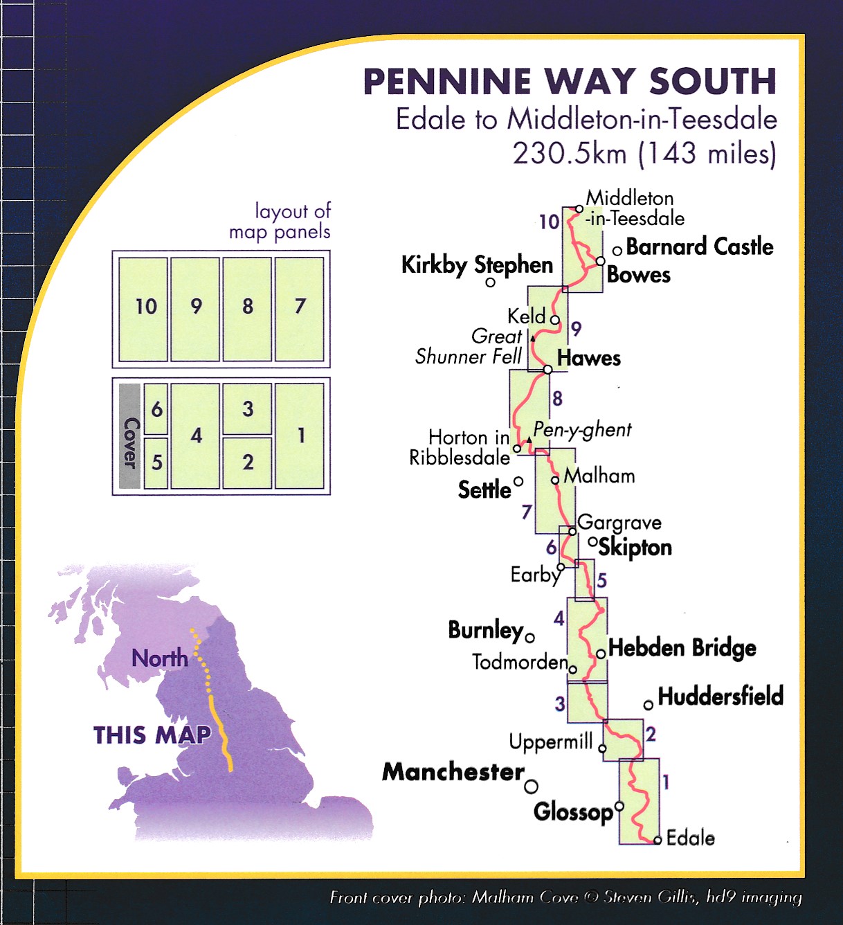 Mooie, duidelijke kaart van het zuidelijke gedeelte van de Pennine Way (Edale to Middleton-in-Teesdale).