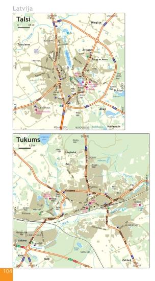 Latvia, Estonia, Lithuania and region of Kaliningrad auto road maps is in scale 1:400 000 and divided in 81 pages. Atlas basemap is also supplemented with plans of 52 largest Baltic cities in scales from 1:50 000 to 1:100 000, as well as Riga, Tallinn and Vilnius plans are in scale 1:20 000. Reader will find Baltic sea region map in the introduction section, and place name index in the final section. Map legend and distance table between largest Baltic countries largest cities is to be found in the cover flaps.