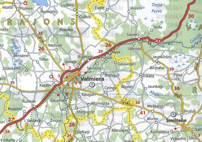 Voor onze reis door de Baltische staten hadden wij deze kaart aangeschaft. Helaas staat er geen informatie op van landschappelijk mooie wegen (groene lijn naast weg), een groot gemis!
