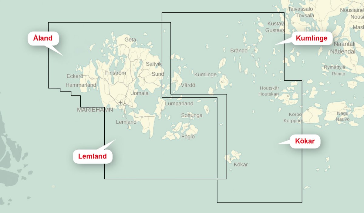 Kastelholm, Bomarsund, Geta, Osnäs, Brändö, Houtskär, Kökar, Föglö, Kumlinge, Lumparland, Lemland, Eckerö, Mariehamn