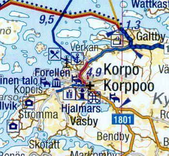 Uitstekende landkaart - fietskaart van de Aland-eilanden en een deel van het vaste land va Finland bij Turku. Veel details, veel symbolen voor toeristische bezienswaardigheden.